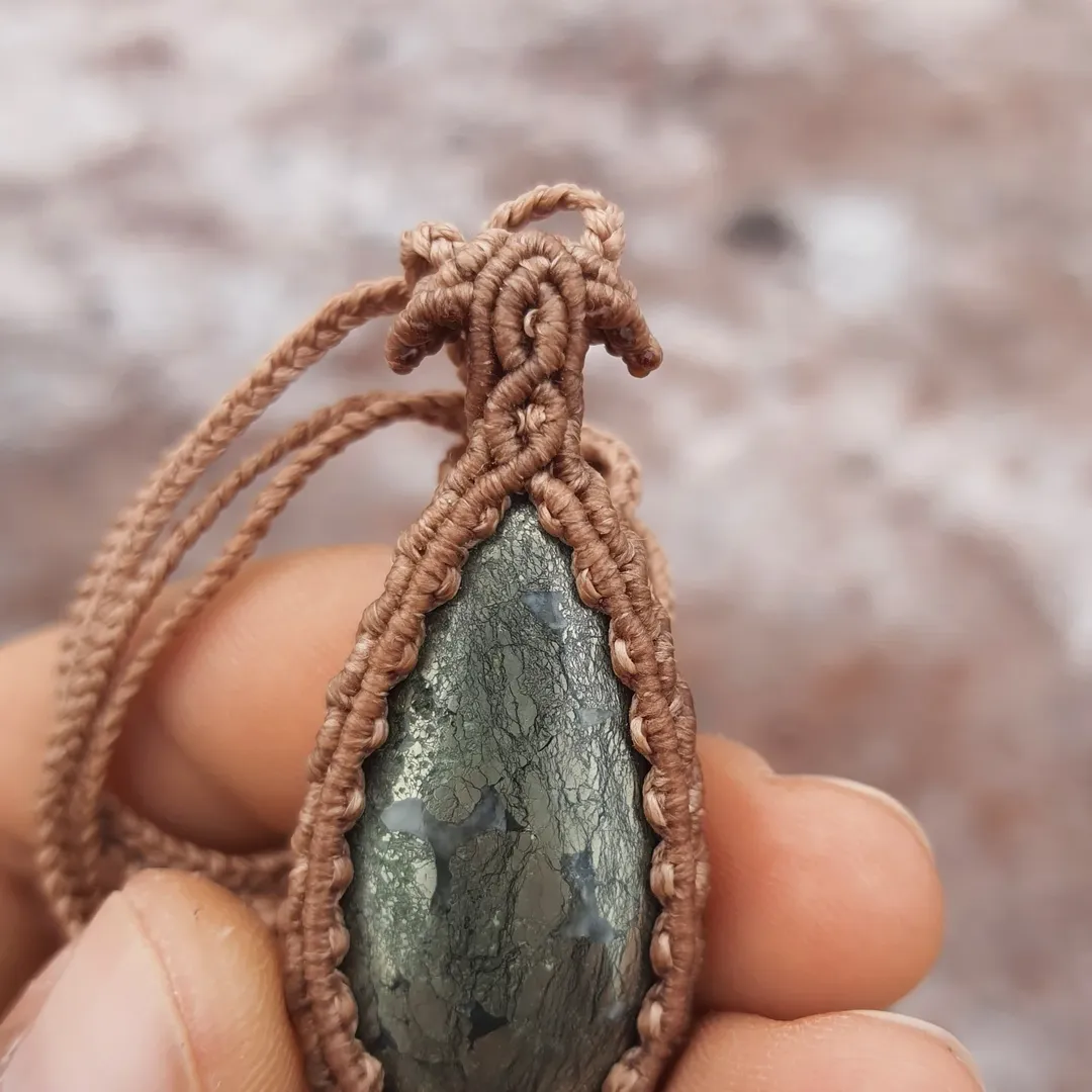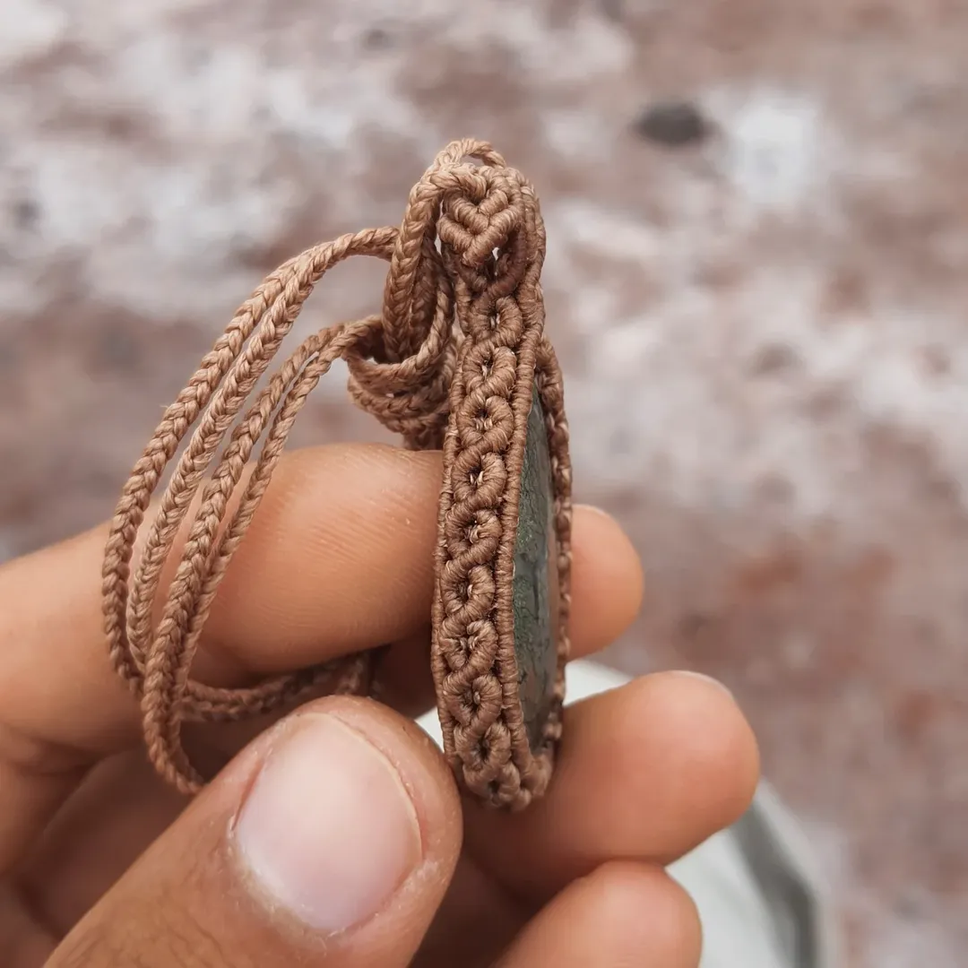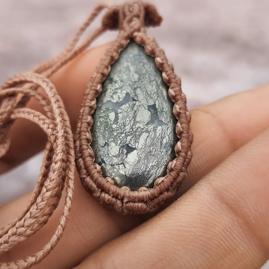 گردن آویز بافته شده با تکنیک گره بافی با سنگ عقیقِ مارکاسیت Handwoven micro macrame pendant With Marcasite stone
