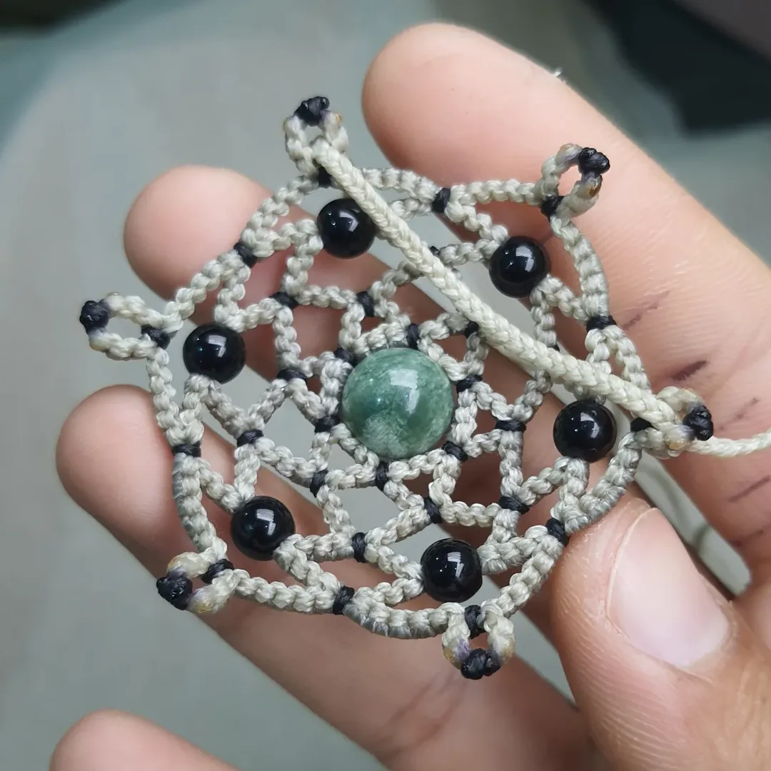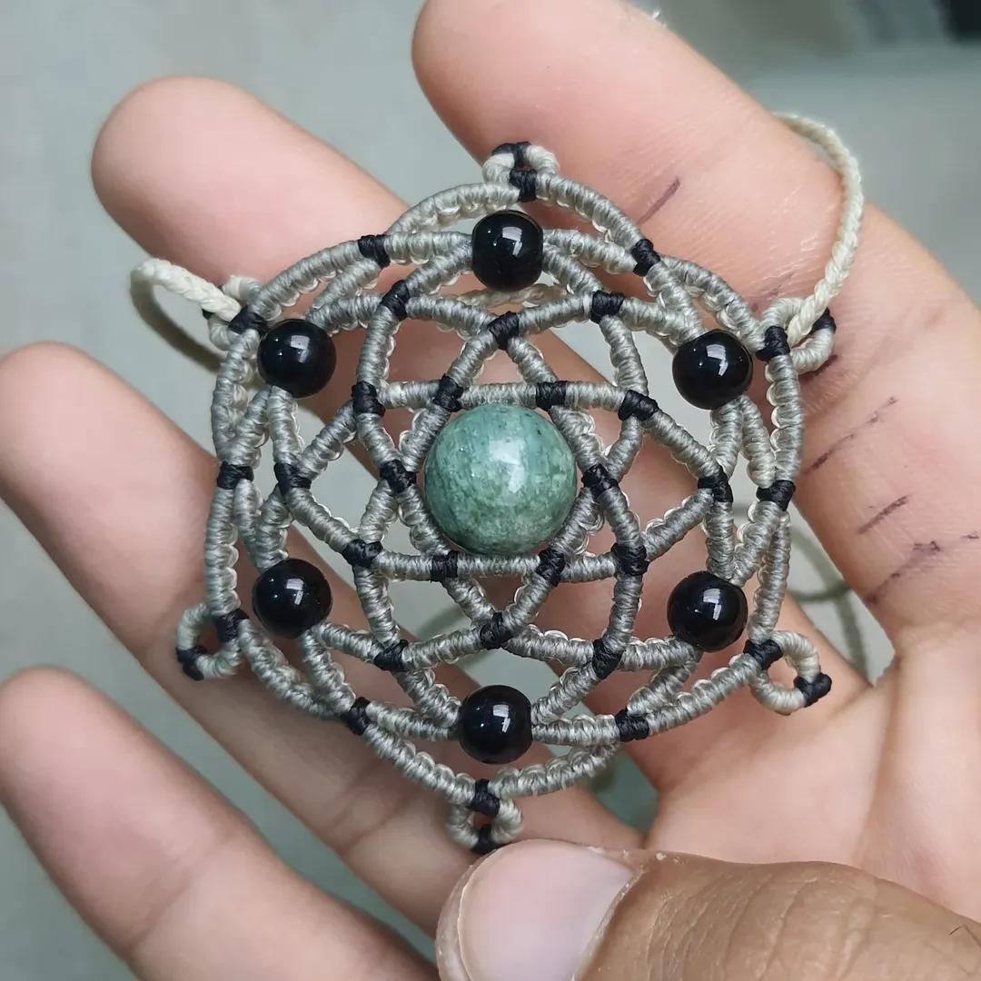 گردن آویز گره بافت، با تکنیک میکرو مکرمه با سنگ یشم و اونیکس Handwoven mandala necklace With jade and onyx